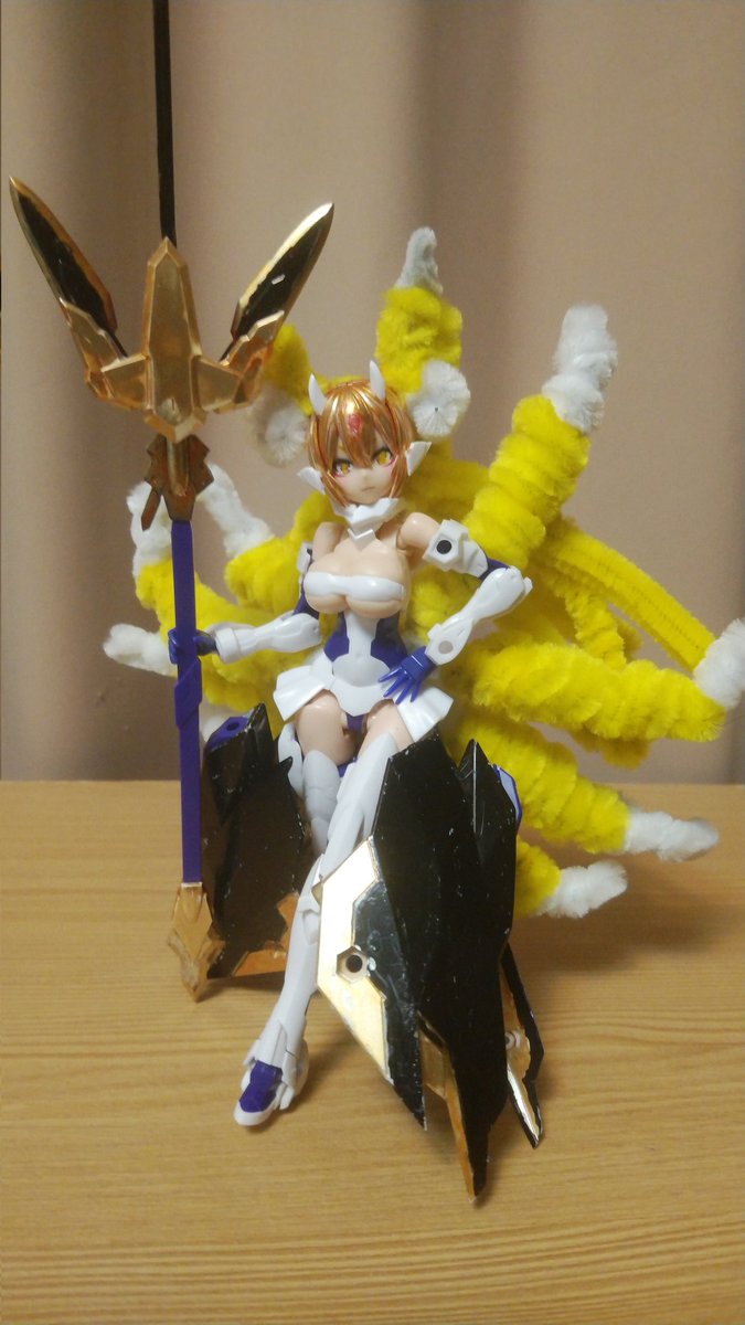 本体に繋がってる尻尾は1本、あとの8本は放射状に繋がってて、本体に繋がってる尻尾の根元の方で繋げてあるモールを結わえて9本になってます。 #メガミデバイス