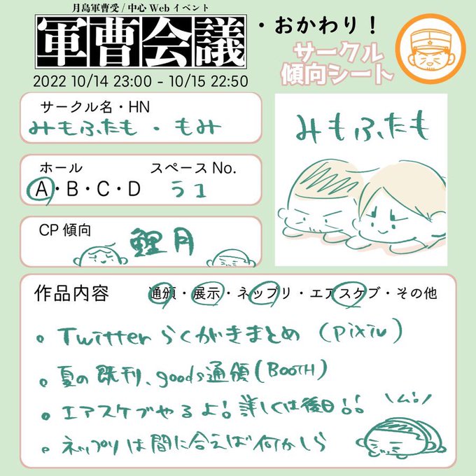#軍会アフター リンクからpixiv(らくがきまとめ)とBOOTHに飛べますー。 売り切れたと思った軍会挿絵シールが出てきたのですが、BOOTHで他のものを購入された方でほしかった!という方がいらっしゃいましたらDMリプBOOTHのメッセージからご連絡ください! potofu.me/momimom