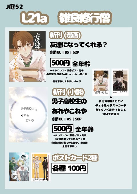 4/2 J庭53のお品書き確定版です🙌 (載せ直しすみません💦) 当日お気軽に遊びにいらしてください🥰 以前出した既刊とポストカードも持っていく予定です🙌 #J庭53 #創作BL #お品書き #JGARDEN53