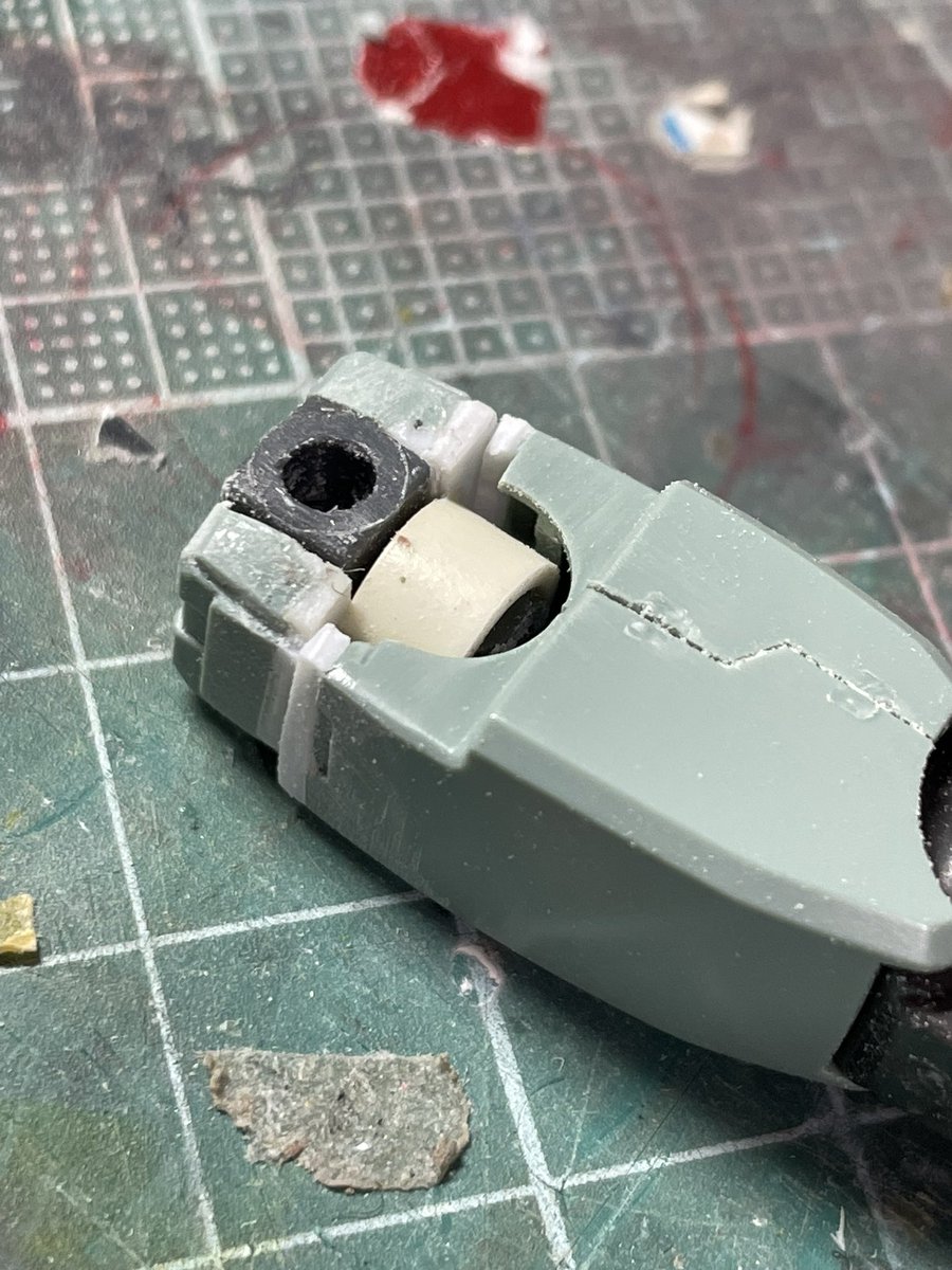 か細くてポリキャップ丸出しの首をプラ板と高切削瞬着で囲み、太くしました😁 確かにこれで塗装も可能に😉👍 前中央に穴は開けておいたのであとはそれらしくディテールも追加しときます。 #ジム・ストライカー #HGUC #ガンプラ twitter.com/555bancha/stat…