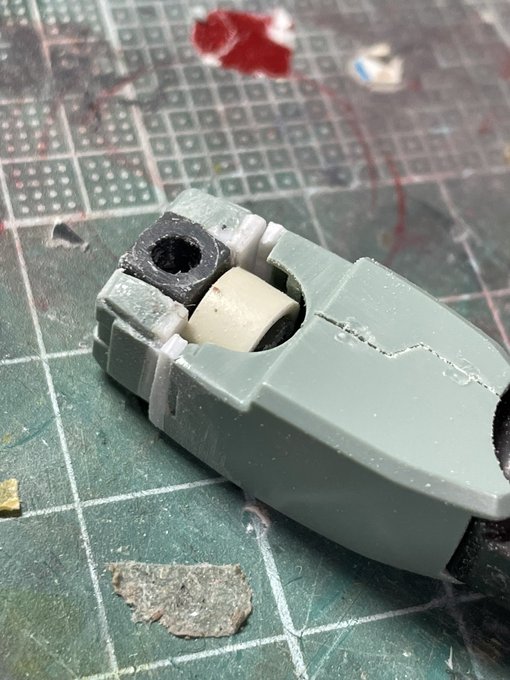 首パーツの延長工作も👌🥴 首ポリキャップパーツを挟む部分に1mmのプラ板を挟み、逆に上部分をスピンブレードで切削。 これで首の1mm延長完了(`_´)ゞ 埋もれていた感が解消されました😁 #ジム・ストライカー #HGUC #ガンプラ twitter.com/555bancha/stat…