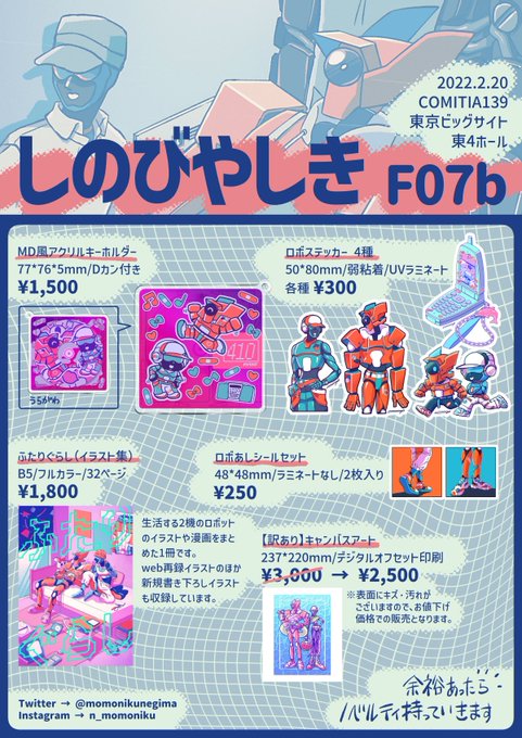 【お知らせ】 来月2月20日(日)開催の #コミティア139 参加しますよ〜🦾❤️🔥🥳 当日は『F07b・しのびやしき』でお待ちしております!! 新刊・新規のグッズは出ませんが、既刊の本やグッズを持ってく予定です💁 #COMITIA139 #コミティア