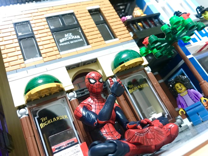 このスパイディあんまり質感が気に入ってなかったけど、モジュールの前に置いてみるとカワイイ。 #オモ写 #LEGO