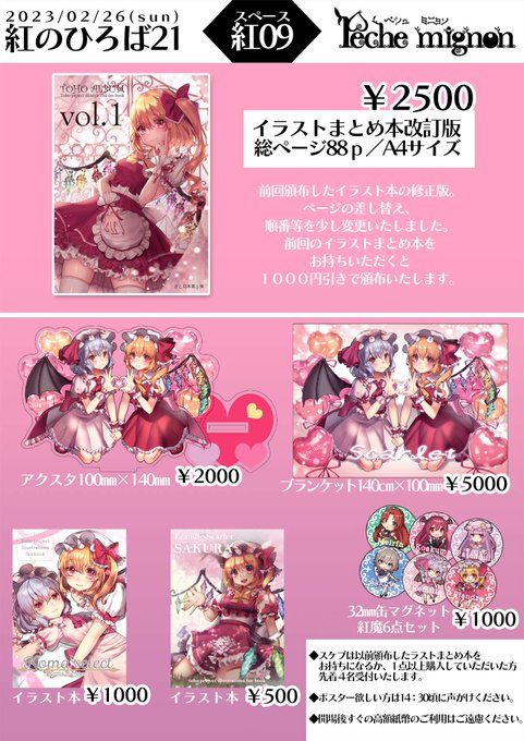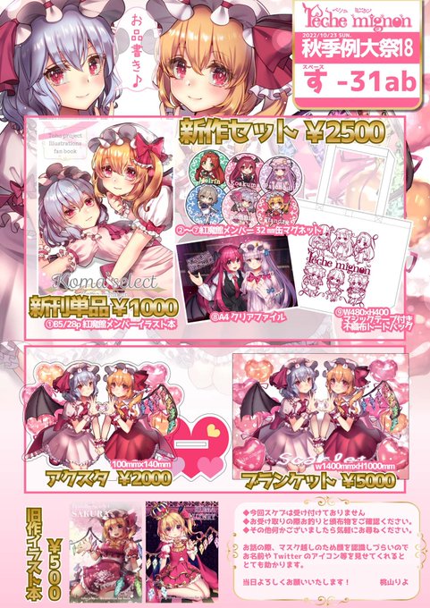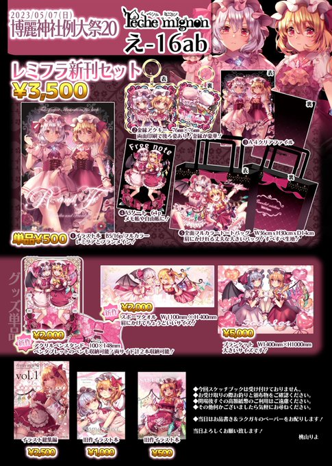 5/7(日)に開催される 博麗神社例大祭のお品書きです! ✨スペース【え-16ab】✨ このツイートの返信欄に グッズなどの詳細をまとめるので よければご覧ください☺️ 通販はイベント後頒布物の在庫を確認してから始めたいと思います! 当日よろしくお願いいたします🎀 #例大祭20 #東方Project