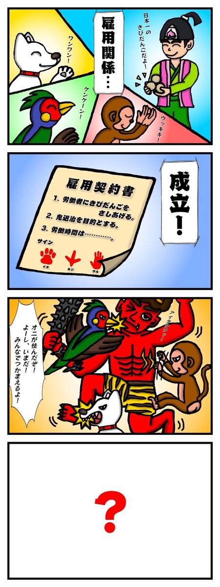 今日は、#労働組合法施行記念日。 労働系ネタ→おとなの…4コマ漫画。「桃太郎 令和ver」 4コマ目は⬇️mongorianthoop.seesaa.net/article/493177… #36協定 #残業 #春闘 #組合 #4コマ漫画 #イラスト #漫画が読めるハッシュタグ #絵師さんと繋がりたい #絵描きさんと繋がりたい #芸術同盟 #アトリエの系譜 #働き方改革