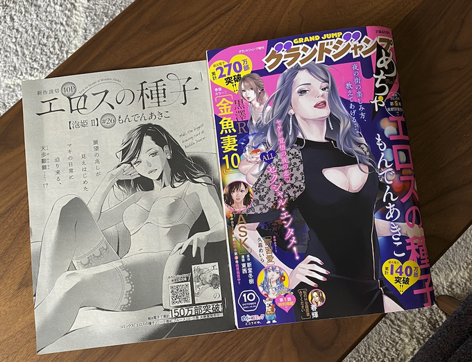 【お仕事状況】新刊『エロスの種子 6』発売中です。グランドジャンプNo.12には新作も掲載されております。恋愛LoveMAXはもんでんあきこ祭りになってます〜! \(^o^)/