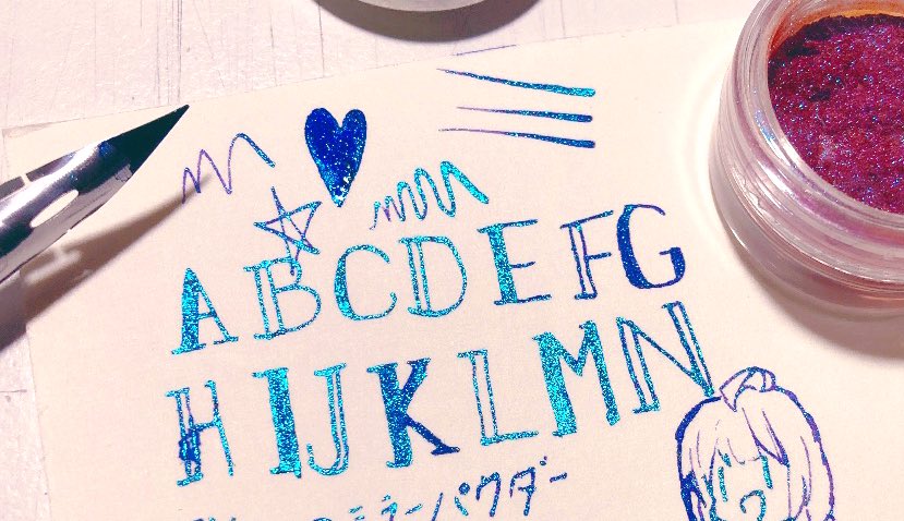 むらさきのカラーインクにセリアに売ってるミラーパウダー(1枚目の端に写ってるやつ)を混ぜて書いたものがこちらです