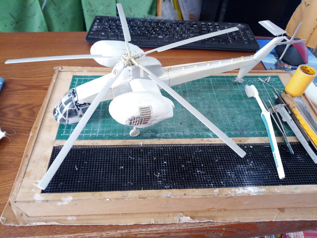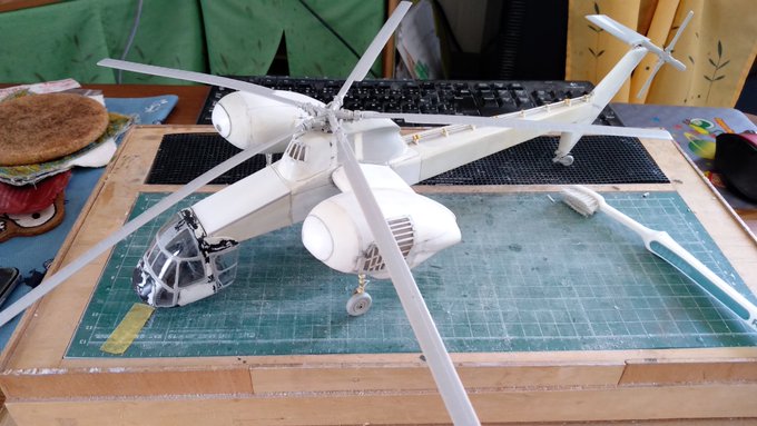 #ちょうだいちょうだい途中写真ちょうだいもっと あともうひとがんばりすれば出来るんだけど。各ローター基部・胴体ディテール付け・パネル・リベット・ウインチ…けっこう有るなぁ…。 。゚(゚´Д`゚)゚。