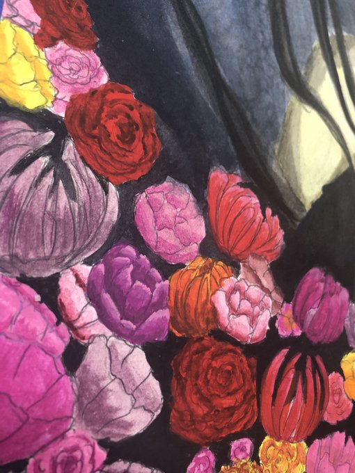 Slow reveal p.2. Flowers... so many flowers. Why did I add so many flowers.... #fanart #criticalrolefanart #Criticalrole #percivalderolo #percy #watercolor #gouache #mixedmedia #flowers #ArtistOnTwitter