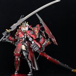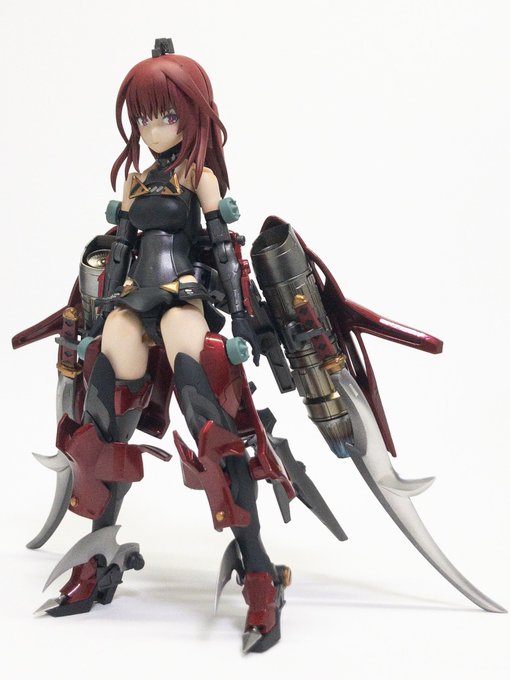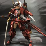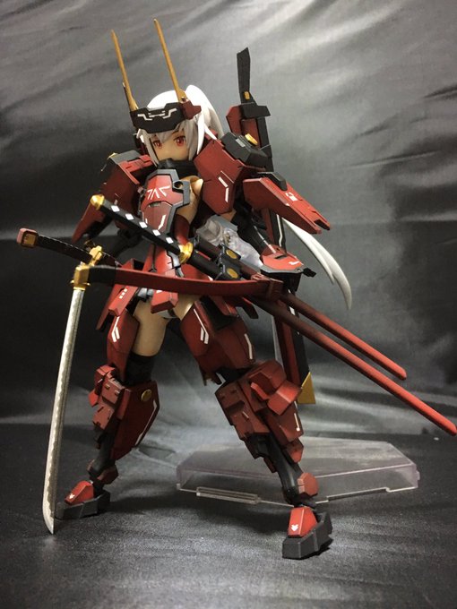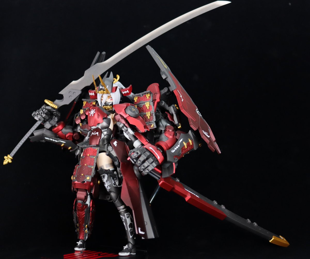 皇巫「カグツチ」完成しました 紅蓮の鎧を纏いしメガミ。背から伸びる巨腕と大太刀であらゆるものを切り捨てる。 真の力を解放せし時、鎧を脱ぎ捨て灼熱の刃を用いて敵を殲滅する。 #メガミデバイス #壽大戦2023