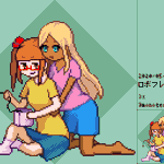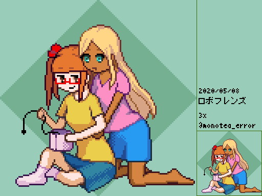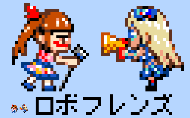 49 55 #5月8日はロボフレンズの日 #ロボフレンズキャンペーン2019 ドット絵で。晶葉とライラでメガホンとマイクを交換。 各32×32の全体で16色、例によって10倍拡大 19/05/08 23:10