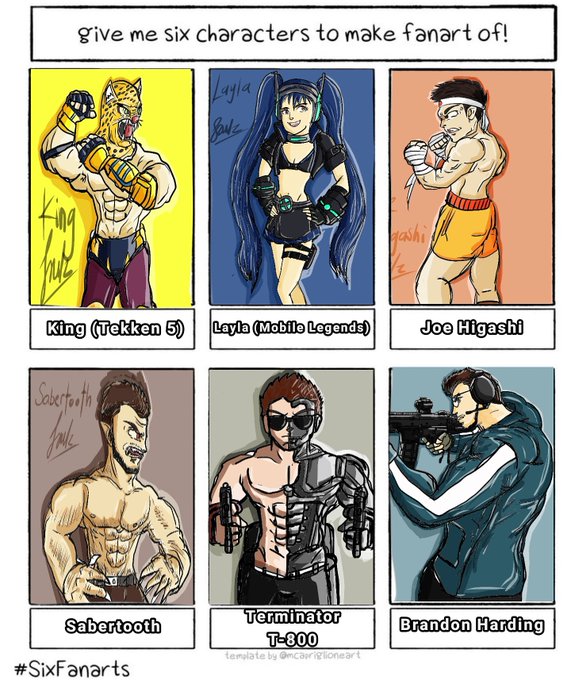 my #SixFanarts / #SixFanartsChallenge is done... King II (Tekken 5 ver.) Layla (Classic Malefic Gunner skin) Joe Higashi (KOF) Sabertooth (X-Men origins: Wolverine Terminator T-800 from Terminator franchise @BrandonHardbody with @Alphalete