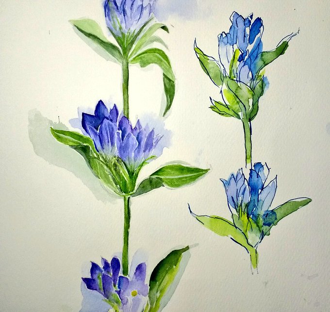永山裕子先生は作品の裏にドローイングを描いてたりされるとか。 私も失敗した水彩紙の裏に描いてみましたが、リンドウ難しいし、絵具が紙にしゅんでいかない。 紙がもったいないから、これからもスケッチとか練習とかに使いまわしたい。