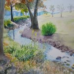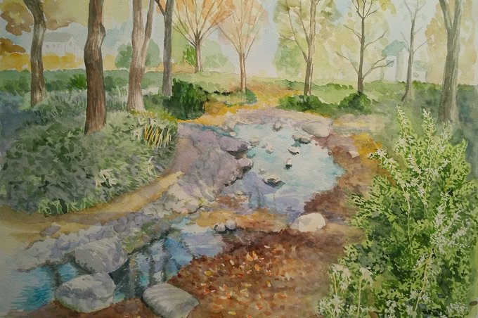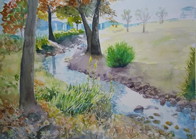 やっと描きました。先月描いた絵と同じ公園です。いまだ秋の風景画です。 水彩紙はラングトンのプレステージF4です。 #透明水彩 #水彩画