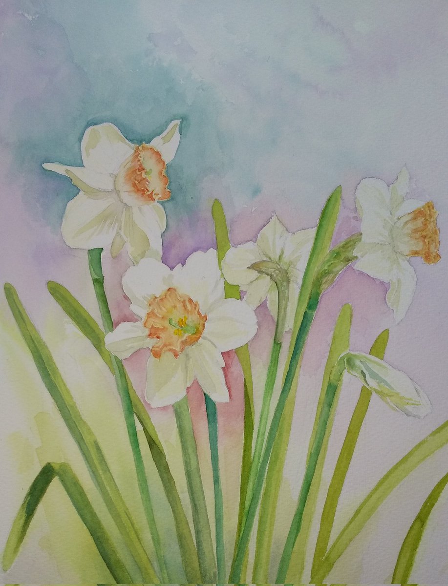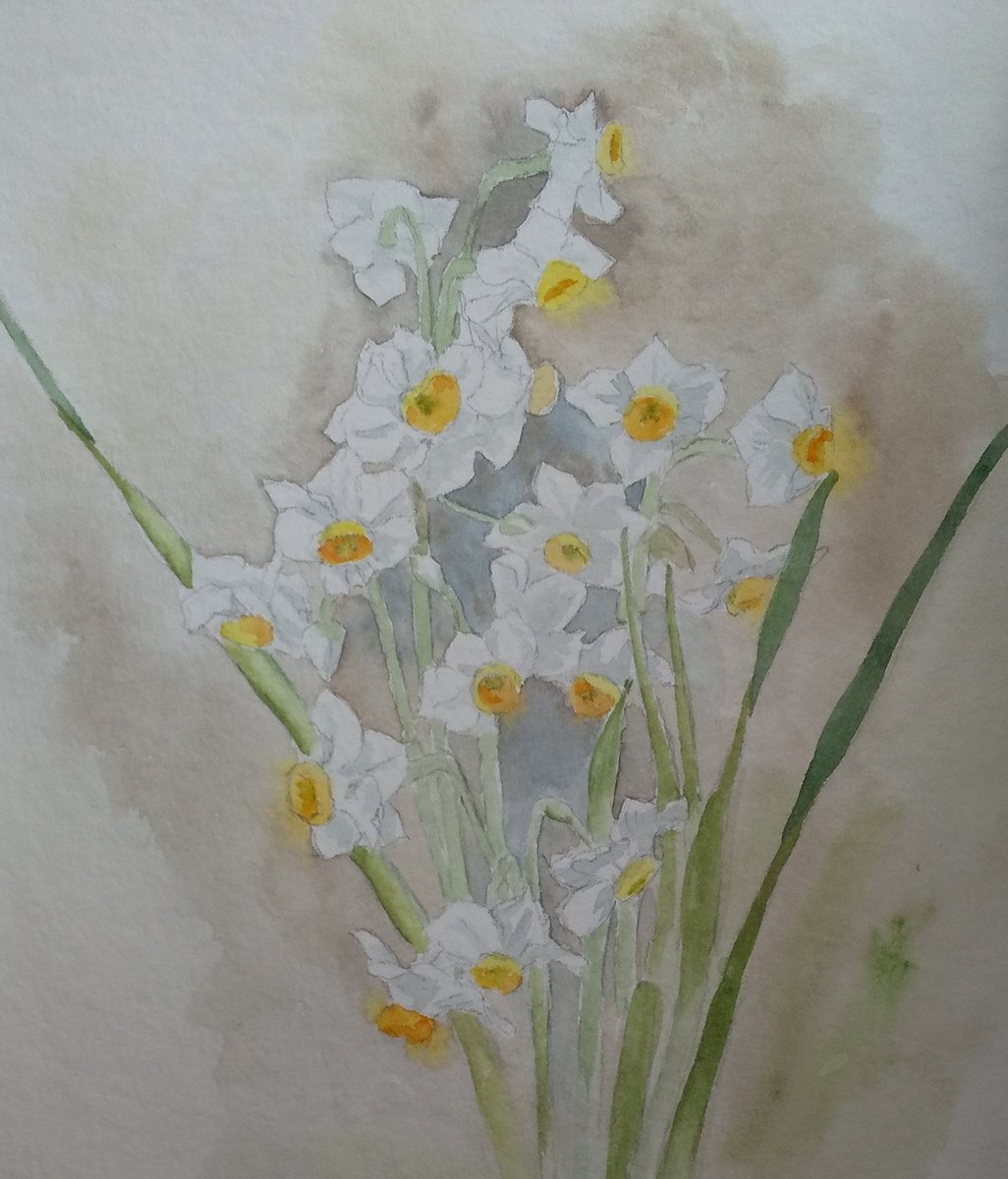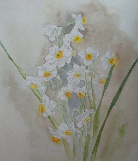先日の雪でベゴニア、ネモフィラ、などお亡くなりになってしまった。ノースポールも怪しいが成長して花を咲かして欲しい。 水仙を描いてみた。すごく良い匂い。色が薄かった?(;´_ゝ`) 水彩紙はストラスモア。 #透明水彩 #水彩画