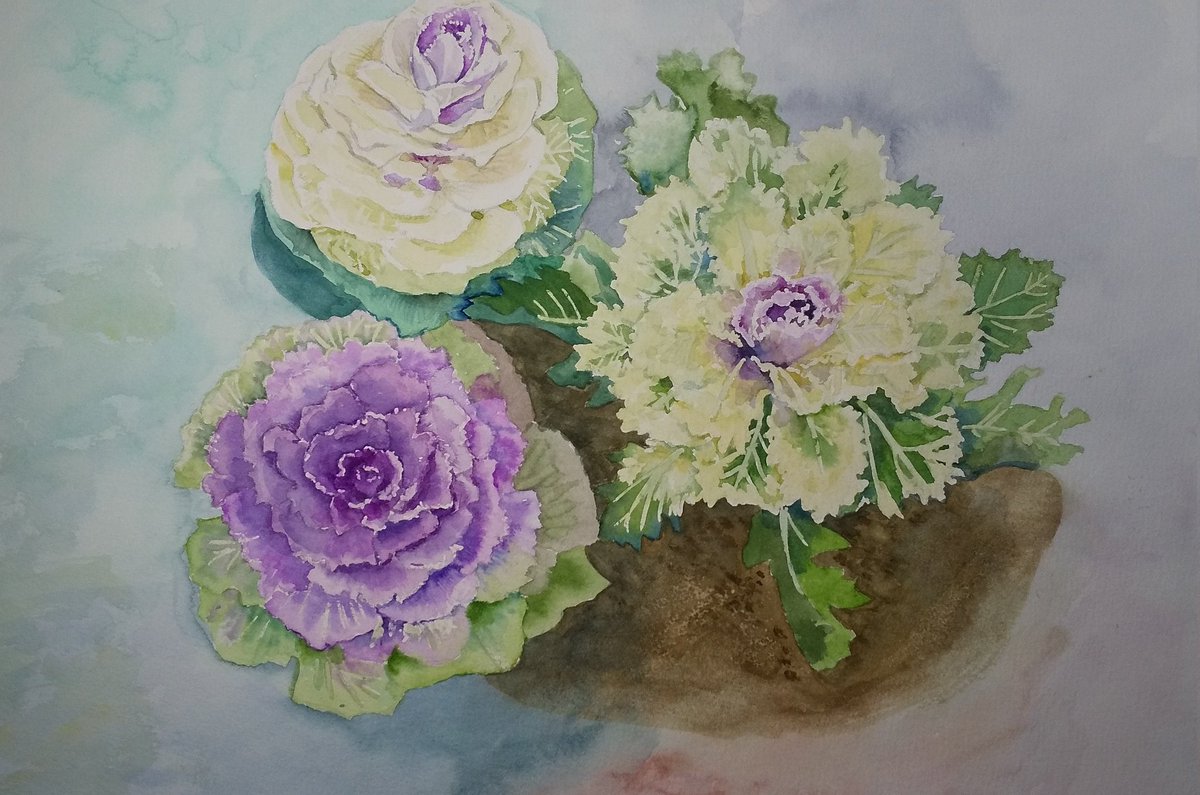 先日の雪で葉牡丹の上に10センチ程積もったけど、全く平気で雪に強い葉牡丹を描いた。 水彩紙はファブリアーノAEW (アルティスティコ、エキストラホワイト長い名前の略) F6。下書きは直接見ながら描いたけど、老眼で疲れるから撮った写真で色塗りしました。 #透明水彩 #水彩画