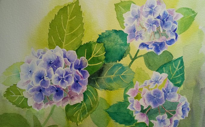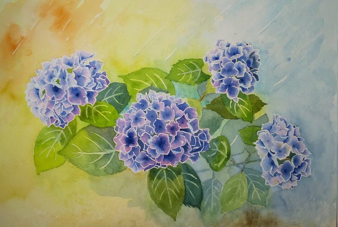 うちの庭の紫陽花を描きました。種類がわからないのですががく?花びら?が厚く白いふちが目立ちます。 普通の玉紫陽花も描いてみたいですね。 背景が色が強すぎたかな。 水彩紙はラングトンプレステージF4 #透明水彩 #水彩画