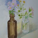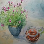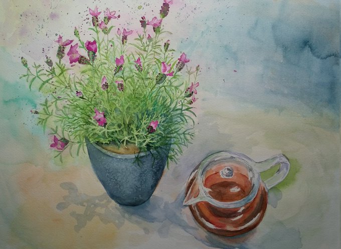 8 145 水彩紙はファブリアーノエクストラホワイトF6 #透明水彩 #水彩画 フレンチラベンダーの花とガラスのきゅうすを買って、描いてみました。画面構成難しいです。花はかなりざっくり描いてます。 23/05/06 16:35