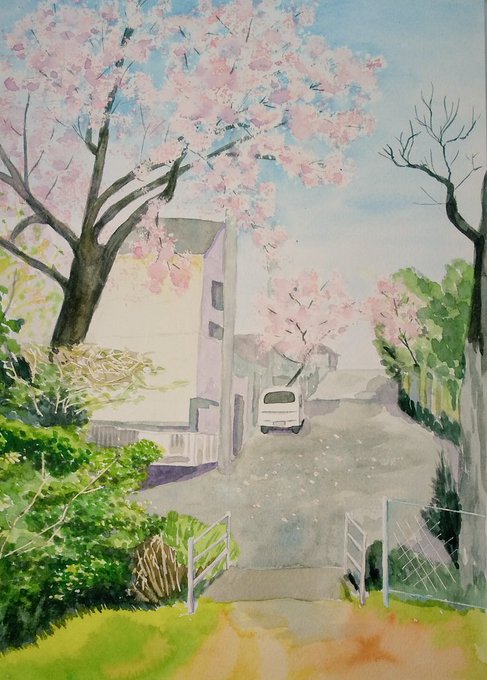 桜のある風景の過去絵 #桜の作品でTLにも桜を咲かせましょう 今朝ため池のそばを通ったら、更地大規模工事で右の絵の桜が根こそぎ無くなってた。 最後の風景になった。