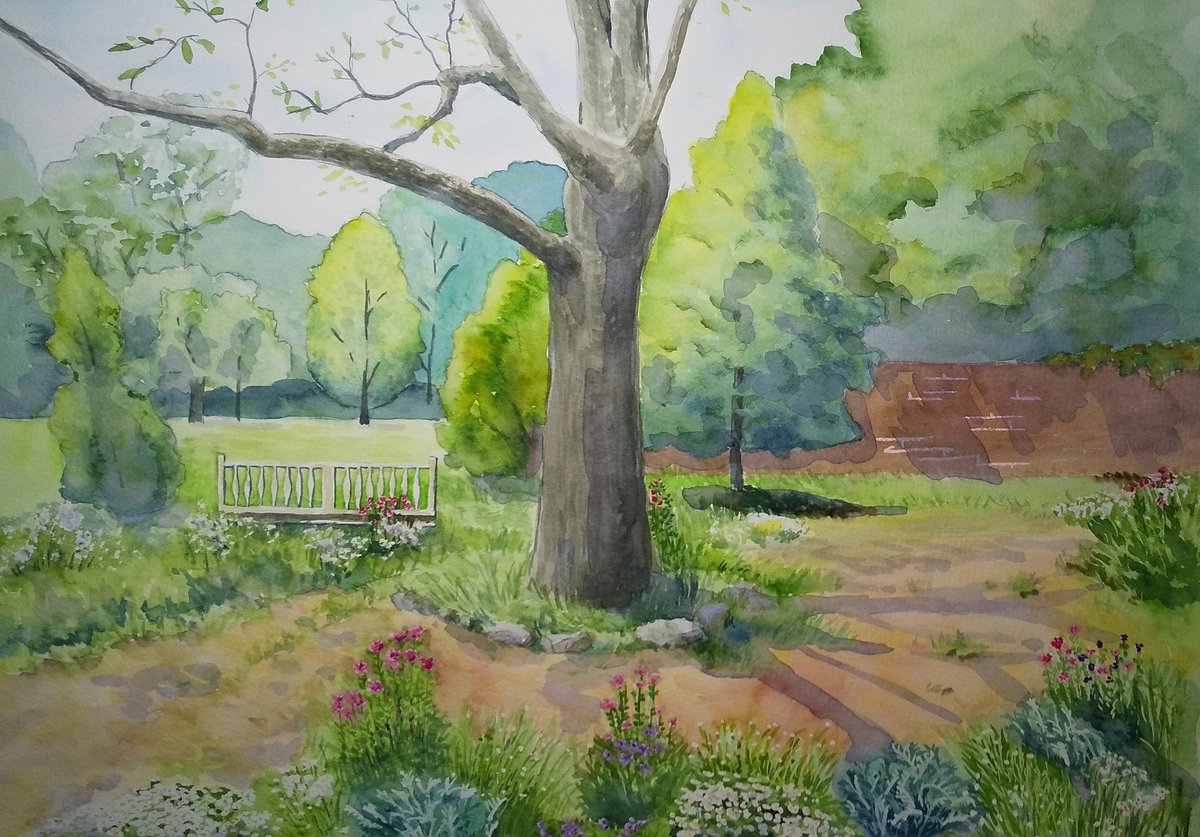 イングリッシュガーデンを描きました。真ん中の木とベンチと花畑が好きな所ですが、全体的に緑だらけで、重ね塗りしすぎたかしらと思います。 水彩紙はファブリアーノF6サイズ #透明水彩 #水彩画