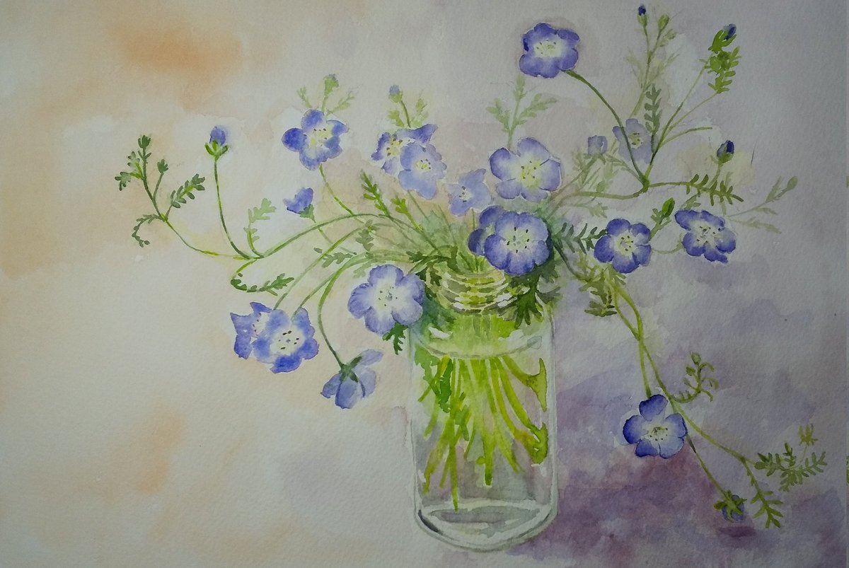 9 141 庭に咲いてたモネフィラを描きました。雪の重さに潰されて茎が曲がったまま成長し、枝垂れ桜のように地を這うように咲いてました。 水彩紙はファブリアーノF4 #透明水彩 #水彩画 23/04/06 08:18