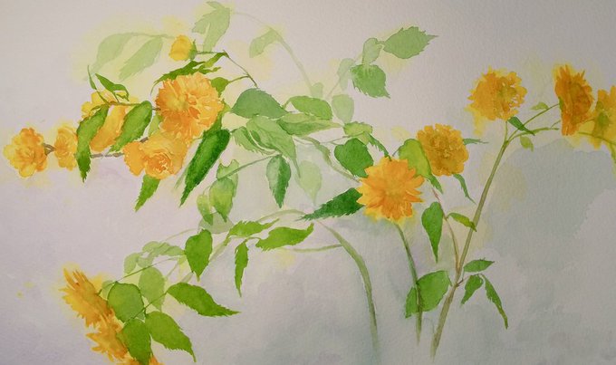 スーパーで買った花を描きました。子供の頃色は和名でしたので、黄色はきいろとやまぶき色でした。今回カドミウムイエローディープを使用したのだけど、もしやと思って調べたらこの花は山吹(やまぶき)という名前みたいです。 水彩紙はラングトンプレステージF4 #透明水彩 #水彩画
