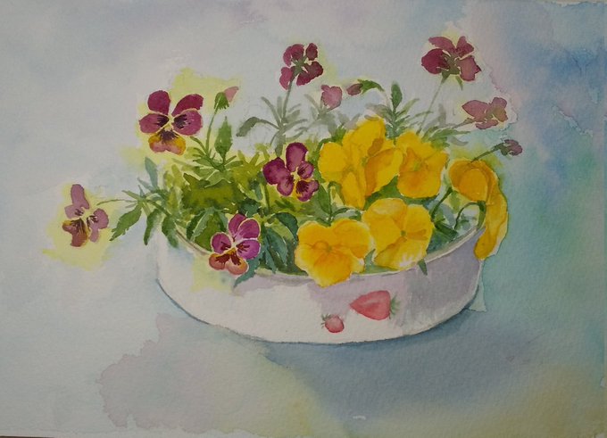 ほんとは数日前には描き終えていたのだけど、4月越えないように上げます。 家に咲いてるパンジーとビオラをつんで、ざっくり描きました。 もっとかわいい色のを植えれば良かったなあ。 水彩紙はラングトンプレステージF4の半分。