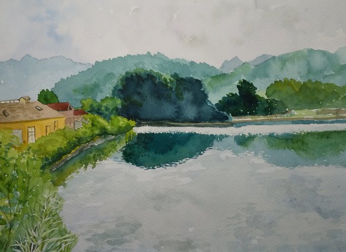 イングリッシュガーデン隣の溜め池の風景を描きました。 やっぱり空は難しいなあ。 水彩紙はラングトンプレステージF4 #透明水彩 #水彩画