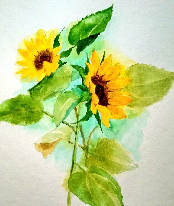 ひまわりが咲いたので、描いてみました。 どうやらこの向日葵は小夏という早生の種類で、種まいてから2ヶ月で開花するようで、目が悪くて説明を見ないで植えてしまいました。 もうちょい夏に咲いて欲しかった。( ゚ 3゚) 水彩紙はストラスモア。 葉っぱが上手く描けなかった。 #透明水彩