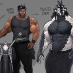 comparison of human to #monster form of that biker #weremonster guy i shared a few days ago! oh, and his name is soan! but his road nickname is mouse. #Monstatronsart #creatureart #monsterart #characterart #doodle #sketch #werebeast #werewolf