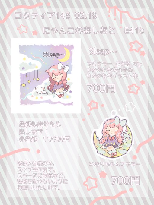 #コミティア143 #COMITIA143 にゃんこのあしあと E41b にて、お待ちしております! 新刊入稿したので、お品書き出来ました!🌙🎀 ねむりちゃんの本とアクキーを出します!! 初めてのコミティア参加で人はあんまり来ないと思いますが、是非遊びに来てくださいヾ(*´∀`*)ノ