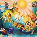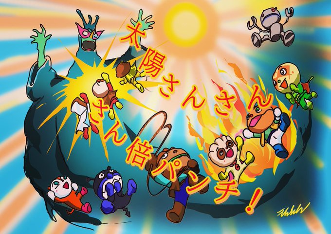 #アンパンマン版深夜のお絵かき60分一本勝負 お題「太陽」 またもミュージカルからで恐縮ですが、黄金の炎のラストシーンです。コロッケとクリームの守った炎のカケラから黄金の炎が復活。最後は太陽の光を浴びたアンパンたちのトリプルパンチで大逆転!今年の巡回作品なのでお近くに来たらぜひ!