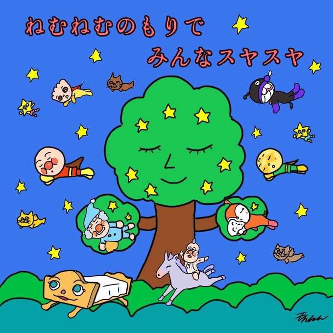 #アンパンマン版深夜のお絵かき60分一本勝負 お題「眠る」 昨晩は深夜まで仕事だったのでリアタイ参加出来ず、明け方描きました。ねむねむの木やねむねむおじさんや夢猫など10年ぶりに描いた気がします。