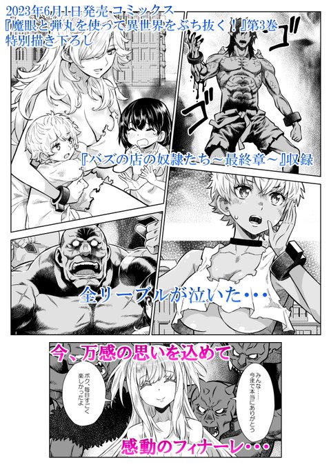 2023年6月1日 『魔眼と弾丸を使って異世界をぶち抜く!』 第3巻発売! 描き下ろしイラストやキャラクターラフ画、 特別おまけ漫画『バズの店の奴隷たち~最終章~』 を収録! 最新情報は公式サイトをご確認ください! firecross.jp/comic/latest twitter.com/montecarloya/s…