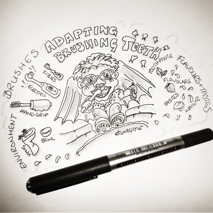 It's that time of year again! #Inktober Some environmental adaptation ideas for #toothbrushing ... apparently gargoyles are conduits for water similar to a gullet ... consider just using water if toothpaste is distasteful! #occupationaltherapy #inktober2022 day1 #gargoyle