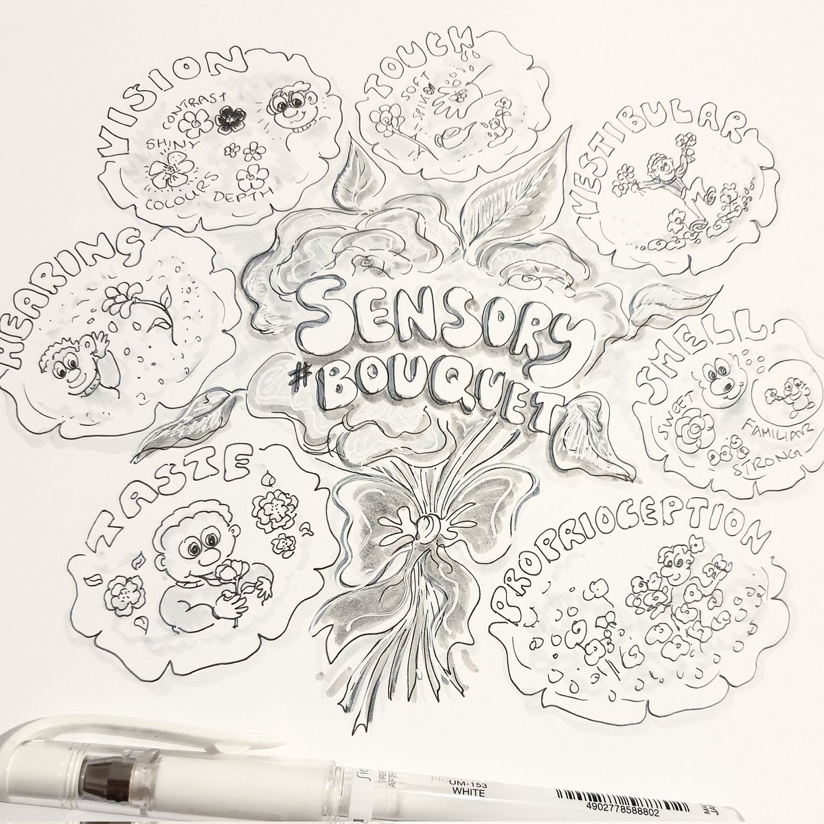 #OccupationalTherapy #Inktober day 6 - a #sensory #bouquet How do you experience flowers? Are they fragrant, squishy, loud, brightly coloured ... or just deliciously tasty? #inktober2022bouquet