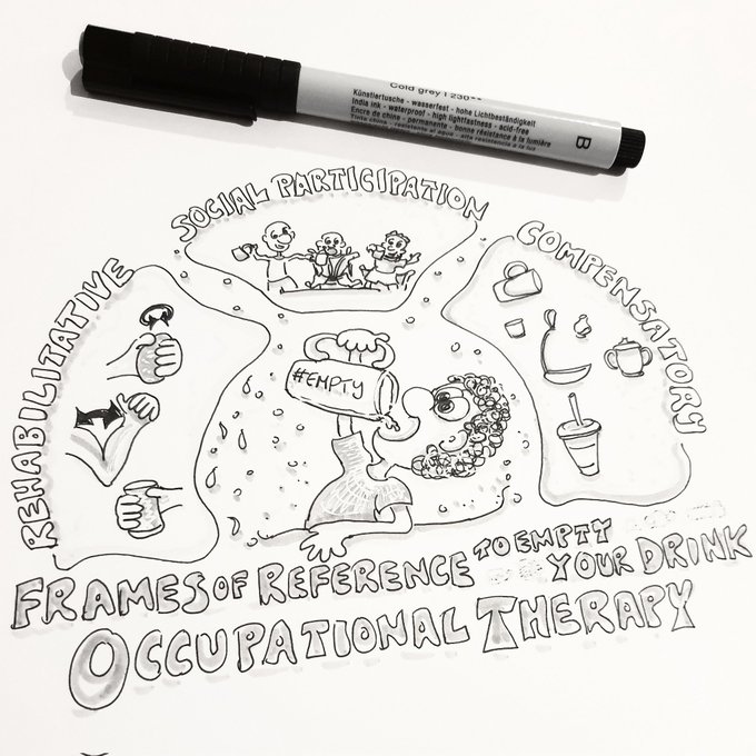 Friday night #inktober day 14 #OccupationalTherapy frames of reference to #empty your drink Rehabilitative - perform goal by focusing remaining abilities Social Participation - emotion motivated goal engagement Compensatory - use techniques e.g. equipment to achieve goal