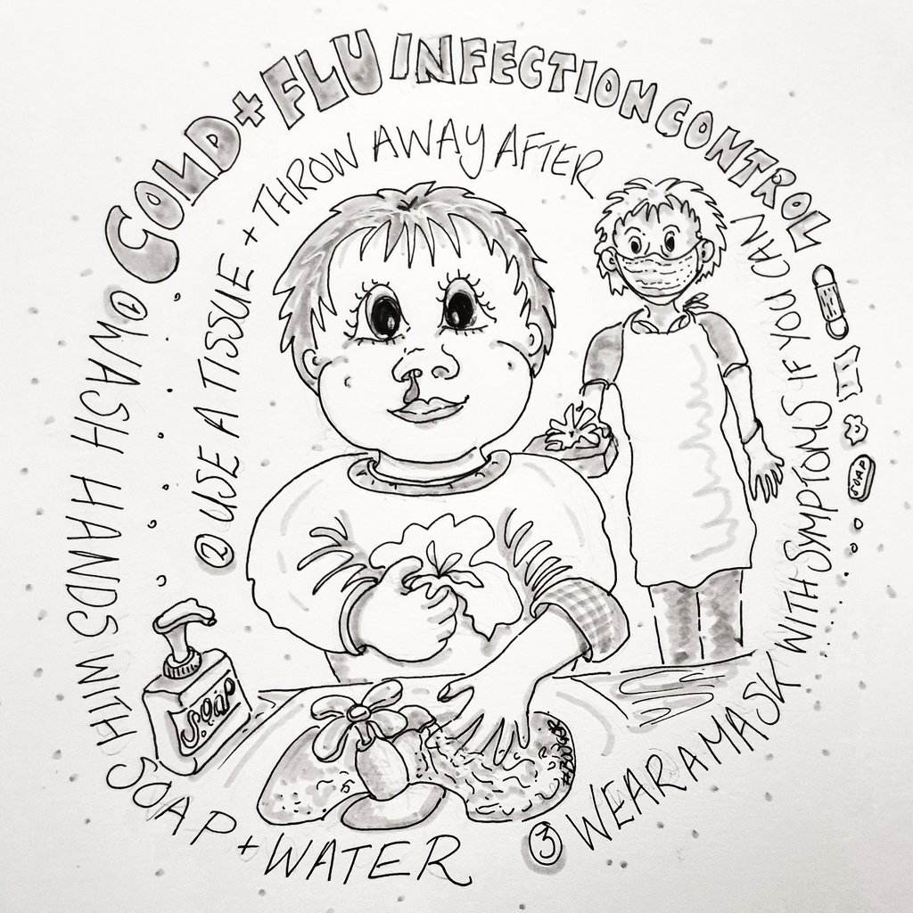 #OccupationalTherapy #inktober day 23 #booger - 3 steps towards cold & flu infection control 1 Wash hands with soap & water 2 Use a tissue and throw away after 3 Wear a mask with symptoms if you can #inktober2022