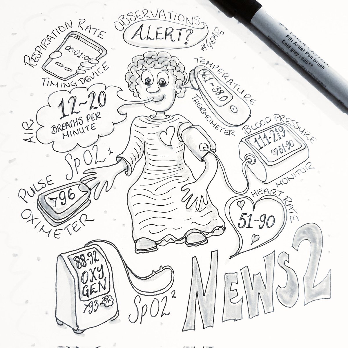 #OccupationalTherapy #inktober day 30 #gear for measuring #news2score Respiration / Blood Pressure / Heart Rate / Oxygen Saturation/ Temperature #inktober2022 #CPD