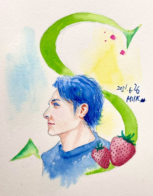 月一お楽しみのイラスト講座。本日の課題は文字をあしらった人物。 ストロベリーのS 収史のS 🤗🤗🤗🤗🤗 #illustration #イラスト #水彩画 #watercolor #眼福ユウコ #柏原収史【柏原収史】 @shuji6931
