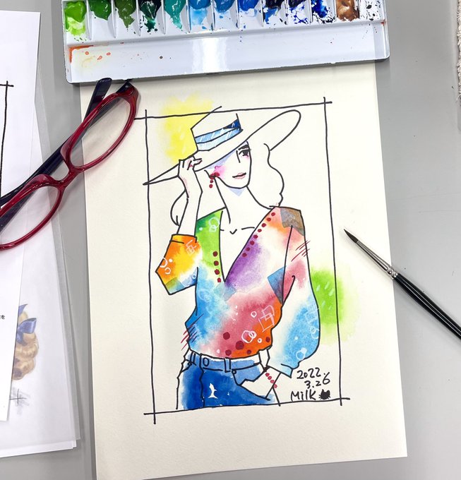 これをこうしてこうじゃ✨ #illustration #イラスト #水彩画 #watercolor #眼福ユウコ 先生のイラスト講座。通常は課題の見本を見ながら描きます。講評なしでその人の個性を大切にした指導をしてくださいます。同じ課題を描いても10人いれば10種類の絵になるのがステキです。