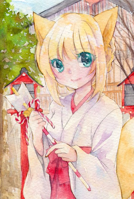 新年の空気感あるうちにあげたかったけど全然間に合わなかった絵。笑 せっかくだから完成させました。 狐っ娘ちゃん。 #創作イラスト #透明水彩