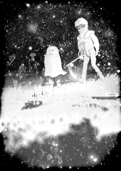 十数年前のオリジナル作品だけど、気に入ってる作品。 イメージ的には、自販機が並んでる駐車場側から見た、頭部分だけ機械が見ててる遊園地。といったところ。 #illustration #monochrome #landscape