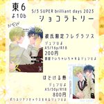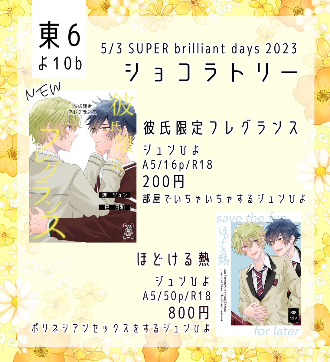5/3 SUPER brilliant days 2023 楽園への誘い3 東6よ10b ショコラトリー Edenプチのお品書きです ジュンひよの新刊と春コミの既刊を頒布します よろしくお願いします💙💚 新刊サンプル→ twitter.com/moonlight92211… 既刊サンプル→ twitter.com/moonlight92211… 新刊通販→ ec.toranoana.jp/joshi_r/ec/ite…