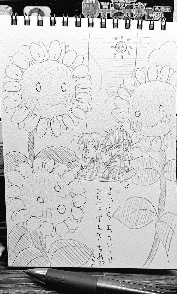今日の落書きφ(..) ひまわりと こえ燭と こえへし 描いてる途中で飲み物取りに行く途中ヘッドフォンがずれ落ちて壊れたの地味に辛い…