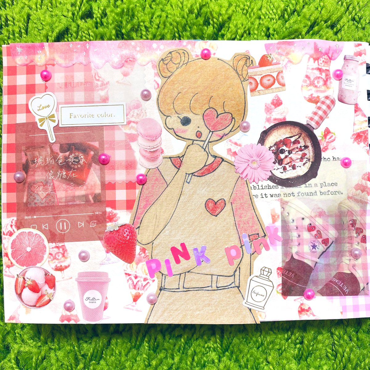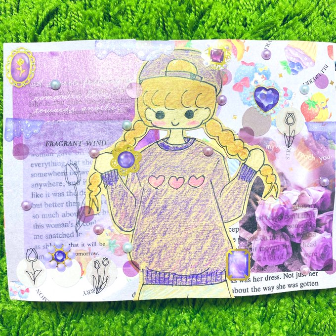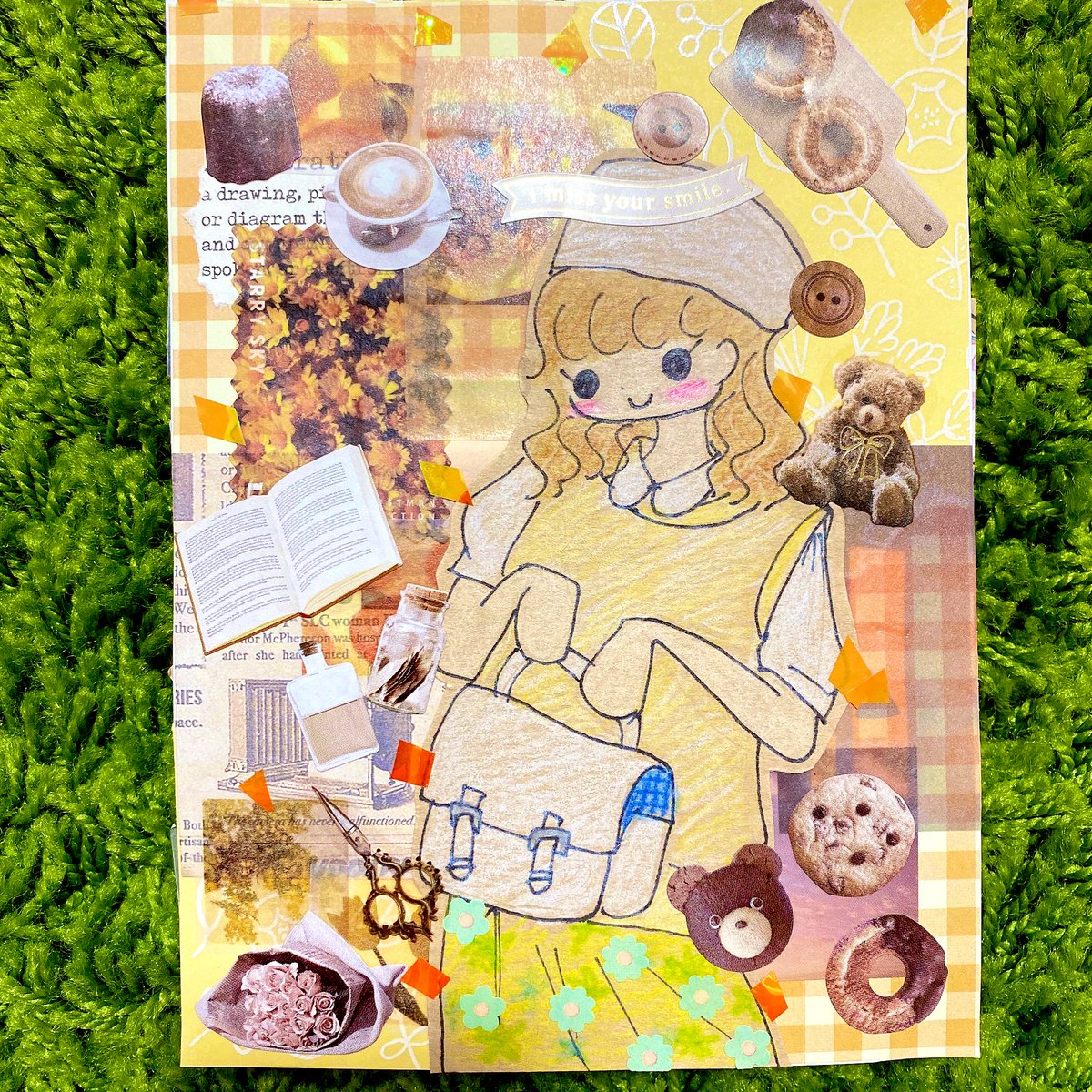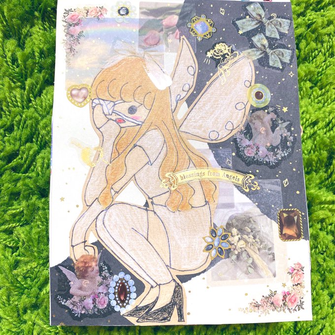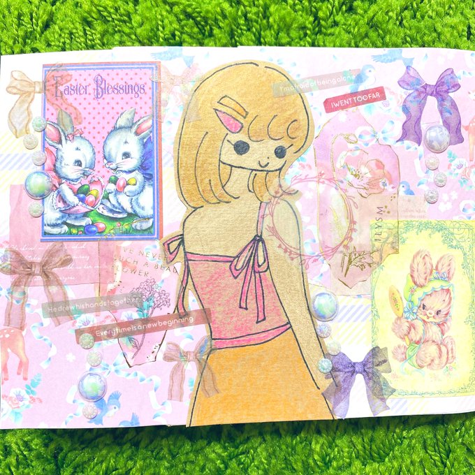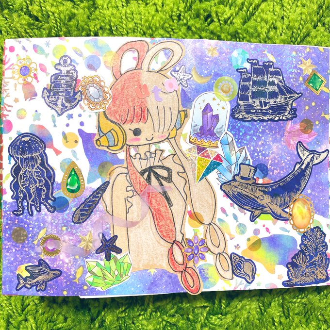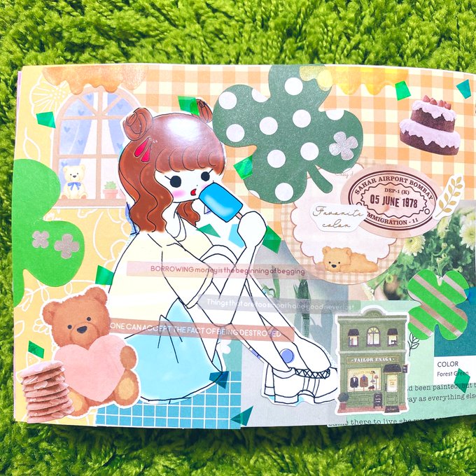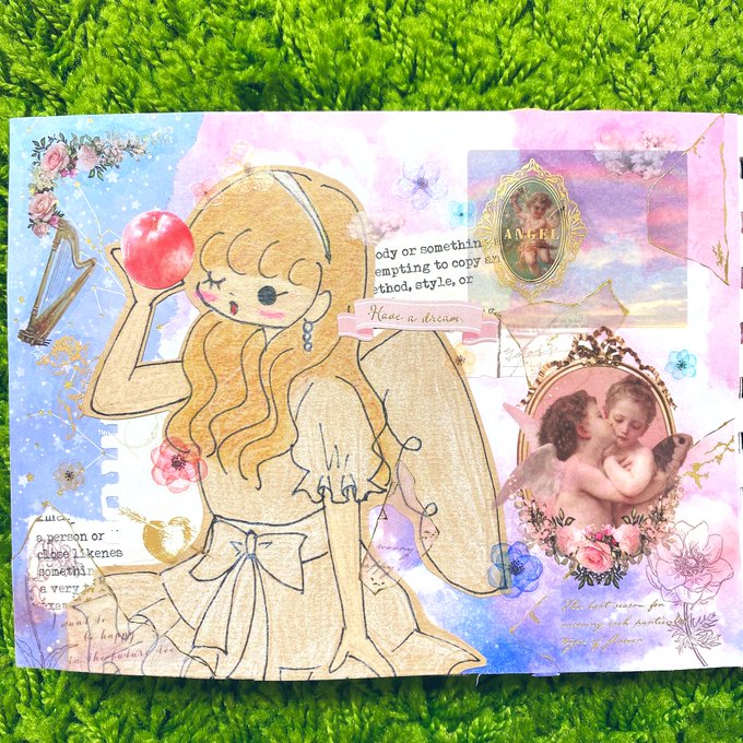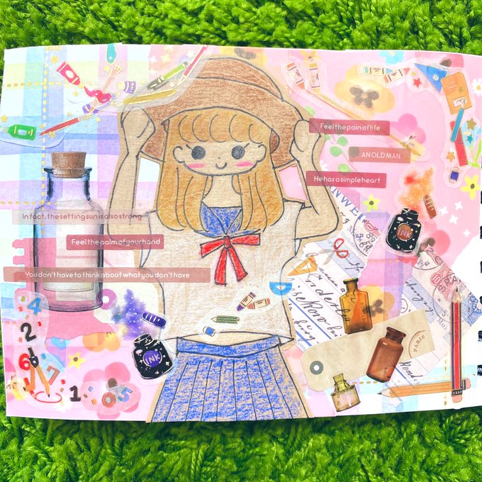 セブンで試し刷りしたイラストでもう1回コラージュしました☺️🌻前回のとはまたガラッと雰囲気変えられたと思います♬楽しかった☺️ #イラストコラージュ #イラスト #コラージュノート #コラージュ #紙モノ #シール #マステ #moriコラージュ
