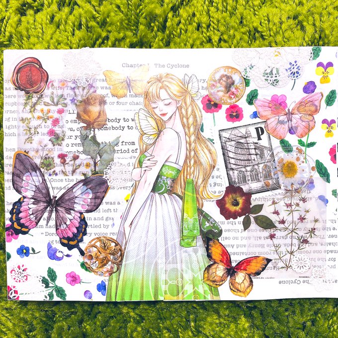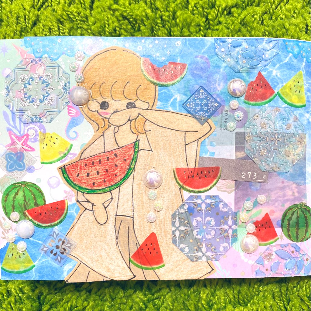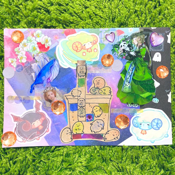 七味ちゃん(@sitimi_karasi7 )とイラスト交換コラージュ🫶 お題を揃えてイラストを描きました🙌 イラストもコラージュも個性が出て楽しい♬ 七味ちゃん、イラスト上手すぎる😆🙏 #イラストコラージュ #イラスト #イラスト交換コラージュ #紙モノ #シール #マステ