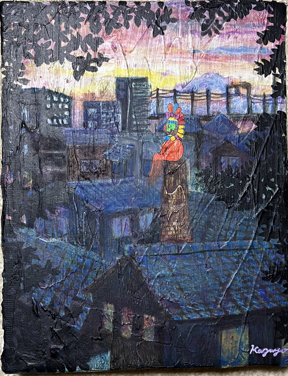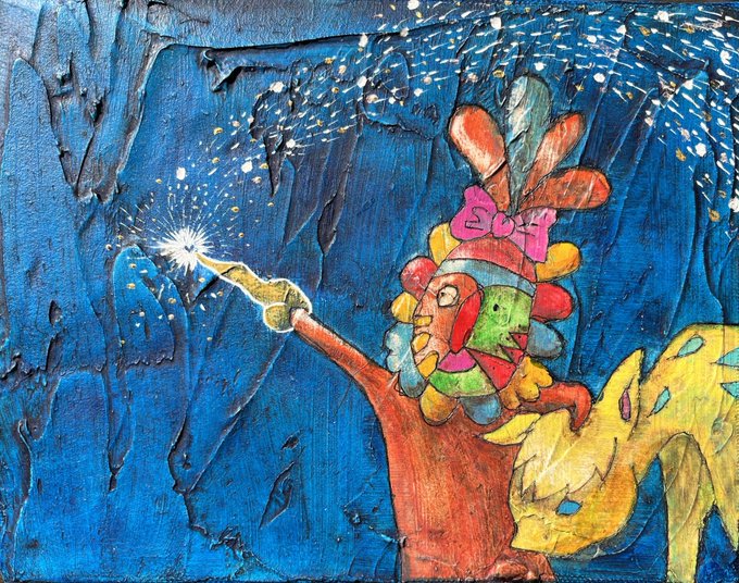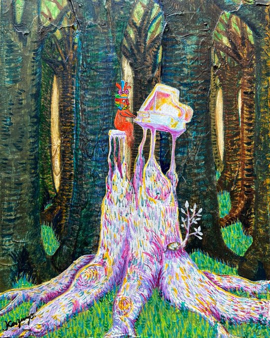 タイトル『静寂』 こちらの絵の中心にいるのは神様です。今、私の住んでいる家の門には神様がいると言われています。その門の神様を描きました。神様の奏でる音は人間には聞こえないであろうと思い、静寂というタイトルにしました。皆様に幸運が訪れる事を願ってます。#ZEROTEN愛知