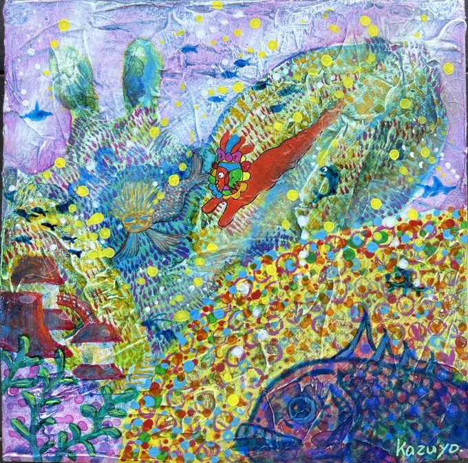 フッカーツ❗️ タイトル『Welceme to ... .』 ZEROTEN愛知.東京に続き、こちらも私の家の門の神様シリーズです 中央にいるのが神様(赤色)です 夏休みのイメージで描きました 南の海の中を人顔した魚と楽しく泳いでいる所です 絵を見て物語を楽しんでいただけると幸いです #ZEROTENSQUARE