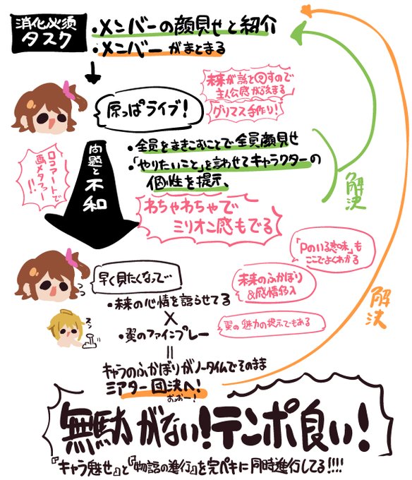 クソ図解で申し訳ないんですが、マジでここらへんの流れが本当~~~~ッに「すっげぇぇぇぇ!!!!」ってなったんですよね…出来が良すぎる…出来が良すぎるぞアニメミリオンライブ… #ミリアニネタバレ感想